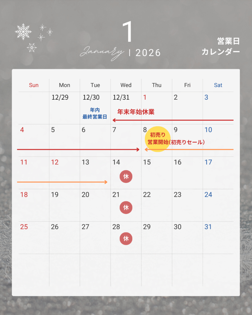 年末年始の営業のご案内 2025年12月26日 最終更新日時 : 2025年12月26日 kokorone_staff 年末年始の営業についてのご案内です。ご来店の際は、下記カレンダーにて営業時間・休業日をご確認ください。